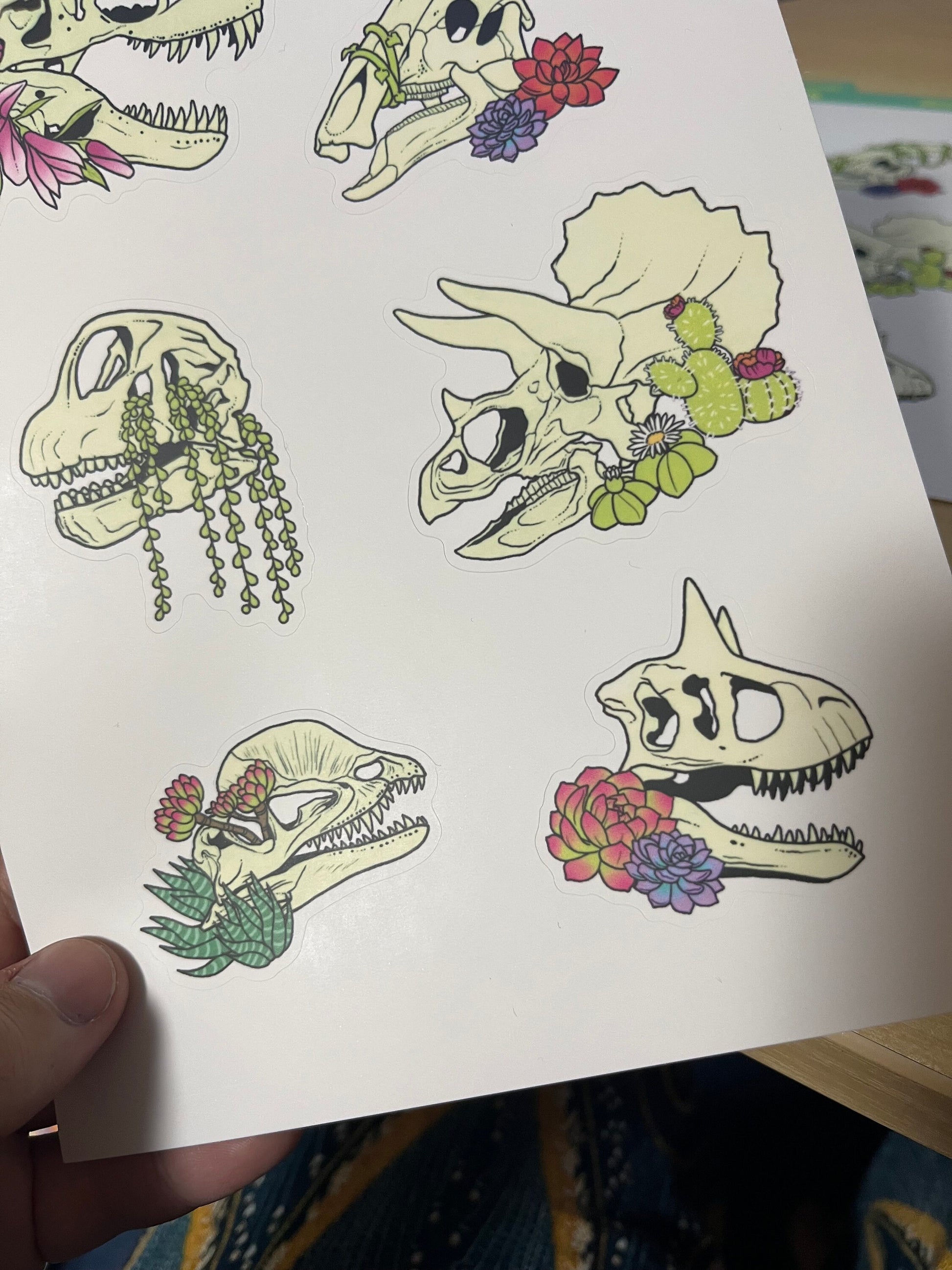 A nice little set of some of my favourite dinosaur skulls surrounded with a few cute flowers and succulents! Brighten your laptop, water bottle or notebooks with these stickers!