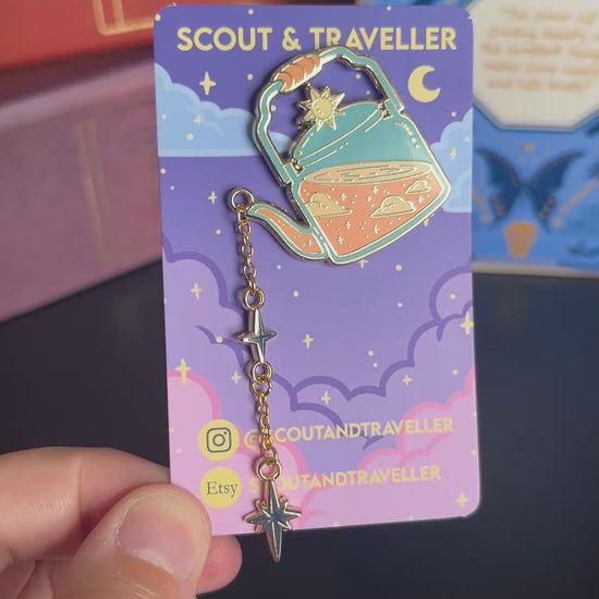 Add a little starlight to your look with one of these teapot pins, super whimsical (I think so anyway!) with a little chain of dangling stars, a unique addition to either your outfit or collection!
